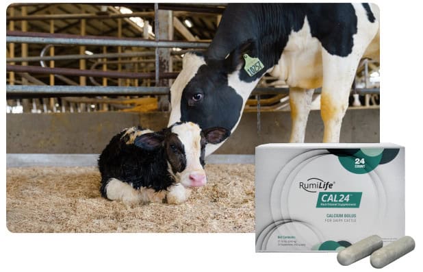 RumiLife® CAL24™ to unikalnie opracowany bolus, który pomaga zaspokoić zapotrzebowanie krów na wapń i zwalczać gorączkę mleczną po wycieleniu. Zapewnia szybkie i długotrwałe wchłanianie wapnia, uzupełniając jego poziom we krwi – wszystko w formie jednorazowego podania dwóch bolusów. Daje Ci spokój i pewność.